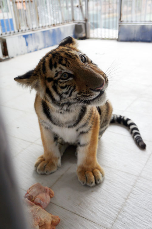 据介绍,老虎的食物包括牛肉、鸡肉、活鸡、活兔等。为什么没有猪肉呢?林杰解释说,老虎的天性是不吃肥肉、不吃腐肉,猪肉相比其他肉质肥,因此老虎不喜欢吃。饲养员沈司金现在负责半岁小虎的每天饮食:“每天小虎都要吃一斤牛肉,三斤鸡肉,而且每个月都会有一只活鸡或活兔,这是为了训练它的捕食能力。”