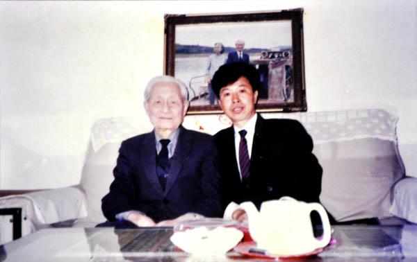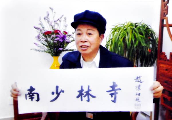 到了农历腊月二十九,我又考虑:国家领导人习惯上,是过了春节大多都要下基层搞调查研究和视察,不在京。为了保证很好地完成这个光荣的任务,我决定放弃“莆田人在天边海角,能回家的都要赶回家做岁围炉”的老习俗,就于1997年2月7日(农历大年三十)赶去北京,第二天的正月初一早,我就上了赵副主席的家,赵副主席夫妇看到我的来到,非常高兴和热情欢迎。我首先向他们夫妇俩老拜年!而后再向赵副主席禀告我的来意,并详细向他汇报莆田南少林经过了专家发掘考古和论证认定的情况。而后呈交莆田县委书记刘可清让我带给他的有关资料。赵副主席很仔细听取我的汇报,又很认真审阅刘书记呈送的资料之后,表示很乐意接受我的请求。又很亲切地对我说:“北京春节很热闹,好好玩,等初四来拿我的字。”赵夫人亦很高兴地说:“今天是正月初一,我给你们俩人合照一张。”照好了,赵副主席发觉前面茶桌上那盆文竹把我们遮住了,就亲自拿开,叫他夫人重照一张。赵夫人为了选好这张的好镜头,她单膝跪着照好了这一张(第二年,省宗教局几个领导来莆田,看到这张照片对我说:“这张照片是蔡副局长你做好宗教工作的大奖状。”)。到了正月初四,我按赵副主席的约定再来他家,赵夫人把赵副主席已写好的南少林寺墨宝交给我,当我拿到赵副主席墨宝的时候,心里十分感激和高兴!在这个时候,我问赵夫人,赵副主席去哪里?她告诉我:“赵朴老身体欠佳住北京医院,今早再去医院了。”赵夫人也很亲切地对我说:“来一趟北京很难得,多玩几天回去。”后来,我在北京再停留了三天,每天的上午都跟赵夫人一起去北京医院探望和陪伴赵副主席两三个小时,以示感恩和安慰!