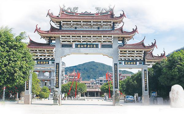 庙宇之前是宽敞整洁的大庙埕,足可容纳成千上万的观众,每年五帝郊游出发仪式和诞辰庆典即在此举行。顶埕西边竖立着一尊唐代石狮,高1.8米,重两吨多,直立方圆柱体,造型粗犷古朴,省内罕见。东边石碑镌刻吕洞宾撰写的《五帝宝经》序文。中埕用花岗石铺设,宽敞平展,美观大方。左右两侧矗立着新建的“龙吟楼”和“凤啭楼”,楼阁架式,三层结构,飞檐翘角,红砖碧瓦,光彩耀目。前埕紧靠笏枫公路处,耸立着一座巍峨壮观的牌楼,三门三楼架构,高低飞檐,琉璃盖顶,金碧辉煌。