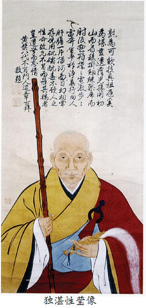 2.释独湛 (1628-1706),法名性莹,俗姓陈,兴化府莆田县人,祖南宋丞相陈俊卿、状元陈文龙,为明著名御史陈茂烈第八代孙,父翊宣,母黄氏,世代业儒。独湛自幼好学,性慈悲,因母早丧,觉人生无常,于16岁时投莆田梧山积云寺礼衣珠剃度,日夜苦修,读《楞严经》《云栖法汇》。隐居壶山潜修两年后,下山参学,先后拜访泉州承天禅寺亘信行弥、福清黄檗山万福寺隐元隆琦、福州鼓山涌泉寺永觉元贤等高僧。南明永历五年(1651),再入福清黄檗山,受具足戒,随侍隐元禅师。永历八年(1654),隐元应请东渡日本,独湛受命伴随,五月十日离开黄檗山南下,六月二十一日从中左所(厦门)乘船出发,七月五日到达长崎。此后开法黄檗,当西堂分座说法。翌年,应远州近藤语石居士邀请,于初山建立精舍,住18年,后赴上野,创建瑞国寺。日本天和二年(1682),承旨继任黄檗山第四代住持。临死前书遗偈云:“我有一句,别于大众;若问何故,不说不说。”世寿79岁,著有《语录》三十卷。知名弟子有圆通、悦峰等。
